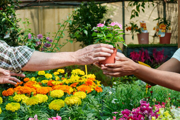 Vibrant nursery scene: A unrecognizable senior Caucasian worker gifting a potted plant to a young African customer amidst colorful flowers and plants.