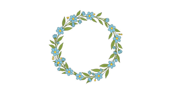 A delightful hand-drawn floral wreath featuring small blue flowers with yellow centers and vibrant green leaves, forming a perfect circular frame.
