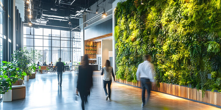 Abstract long exposure motion crowd business people walking commercial centre corporate green office in modern city lobby. Green sustainability natural light indoor plants garden environment