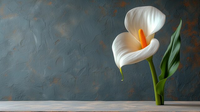 A white bloom with a yellow stamen against a blue wall, bearing a brown centric spot