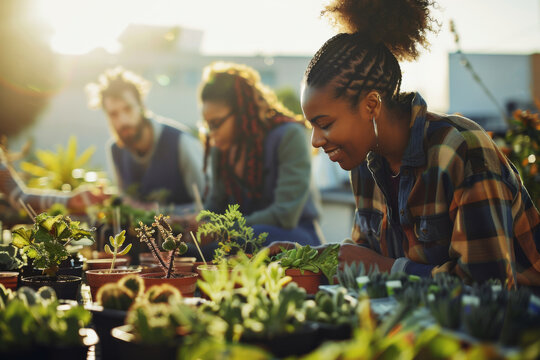 Rooftop garden terrace for plants and sustainable urban lifestyle. Young diverse neighbors plant swap. Community plant lovers club