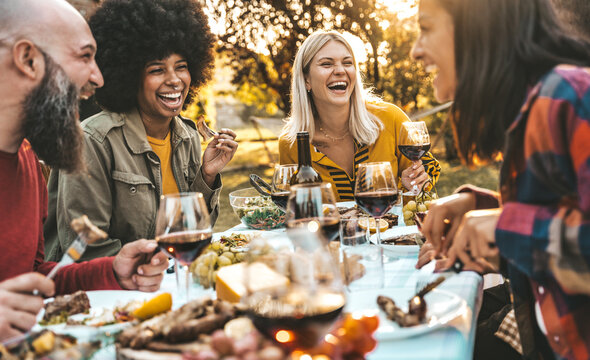 Happy friends having bbq dinner party in garden restaurant - Multiracial young people eating grill meat and drinking red wine in backyard - Food life style concept with guys and girls sitting outdoors