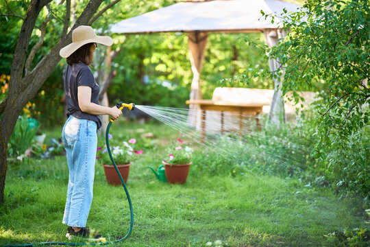 Young woman in hat watering flowers and plants in garden with hose in sunny blooming backyard