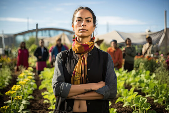 Farmers standing in green fields. Hologram showing agricultural technology icons.