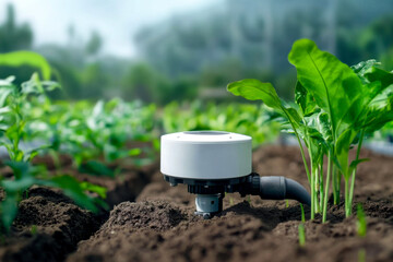 A modern irrigation system is shown in a lush green garden, enhancing plant growth with efficient water management techniques.