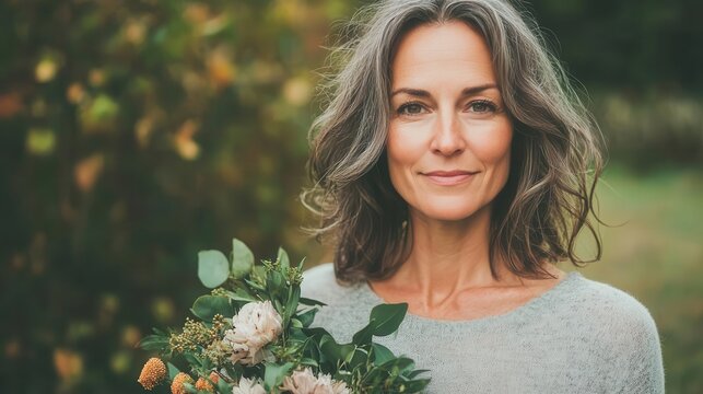 Woman celebrating her 45th birthday, holding a bouquet of flowers, serene garden setting