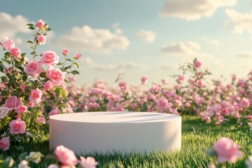 Natural beauty podium surrounded by blooming spring flower field featuring serene pink rose garden for product display in a bright outdoor setting