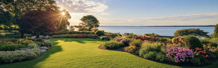 A tranquil afternoon in lush gardens overlooking the serene waters at a beautiful waterfront location