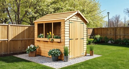 Wooden garden shed in a sunny spring backyard scene
