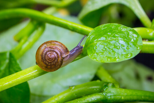 A snail crawling on a green leaf nature background.