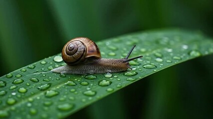 A small garden snail slowly crawls across the damp soil among blades of grass