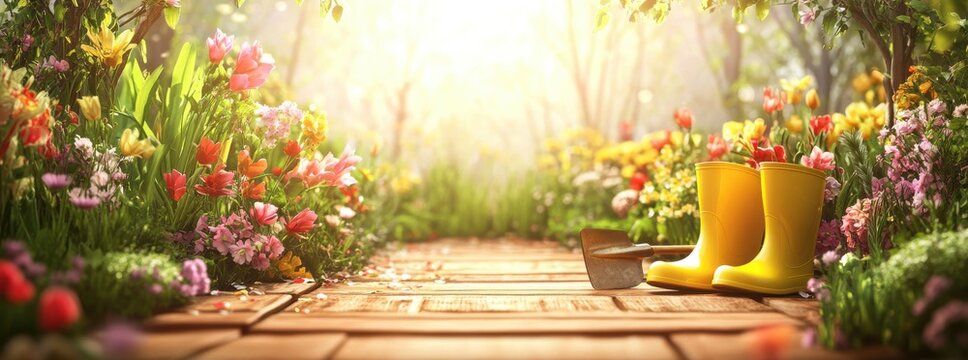 Vibrant Flower Garden Pathway with Colorful Blooms, Yellow Rubber Boots, and a Garden Spade in Sunlit Spring Setting, Evoking a Sense of Joy and Nature's Beauty