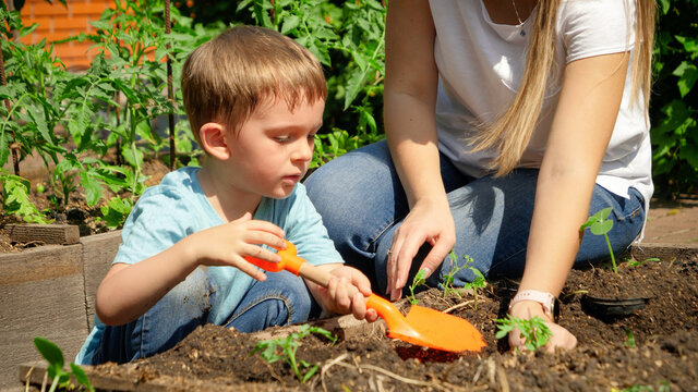 Child with mother working in garden and planting sporuts and vegetable seedlings at backyard