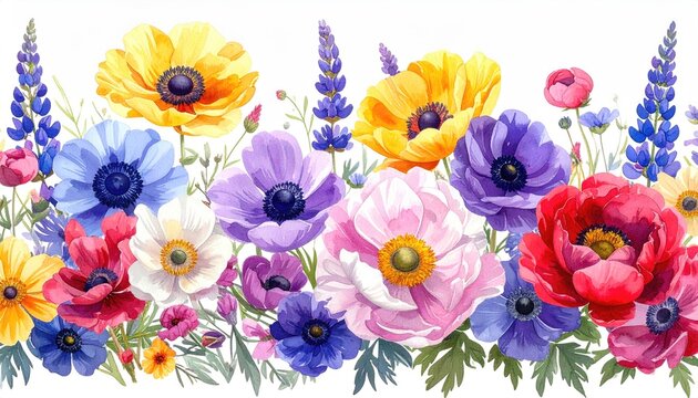 Vibrant tropical floral border with pink, orange, yellow hibiscus flowers, green leaves on white background. Colorful summer themed design for invitations, events, decorative purposes. Exotic
