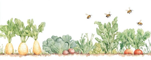 Whimsical watercolor illustration of fresh vegetables and buzzing bees in a vibrant garden setting, perfect for food themes. watercolor Style