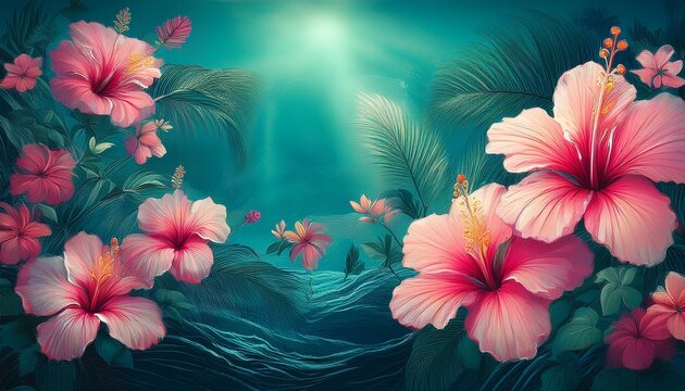 Abstract art piece showcasing a paradise garden with vibrant leaves and blossoms, painted in a contemporary style. Vibrant. Illustration