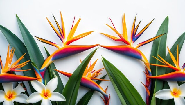 Vibrant bird of paradise flowers with lush green leaves and white orchids on white background with ample copy space