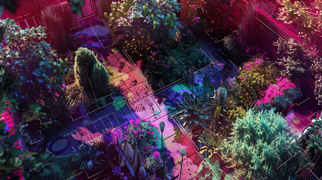 Infuse your gardening advice brochure with a cyberpunk essence featuring an unexpected top-down perspective on a vibrant digitized garden landscape, blending glitch art techniques for a unique visual