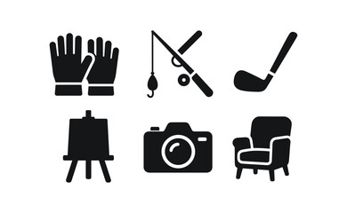 vector solid black filled icons transition to retirement (leisure activities): gardening gloves fishing rod golf club painting easel travel camera reading chair.