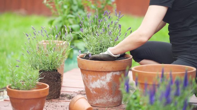 Woman in backyard planting lavender plant / bush in pots outside during the day in spring time.