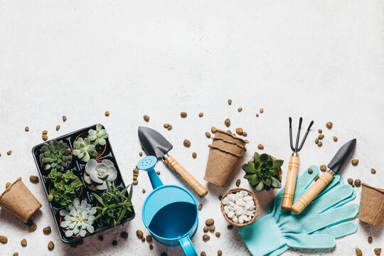 Gardening - set of tools for gardener and succulents seedlings on white table background. Spring garden works concept, home jungle, home hobby for whole family.