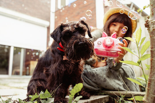 Person and dog embrace new journey in garden setting
