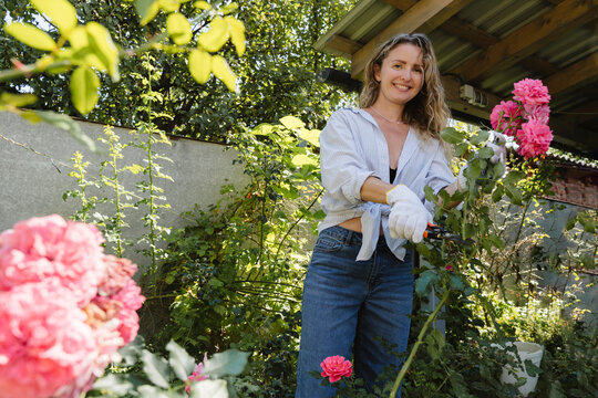 A peaceful gardening session in a blooming botanical garden, Gardening tools and plants arranged for cultivation, Botanical leisure style