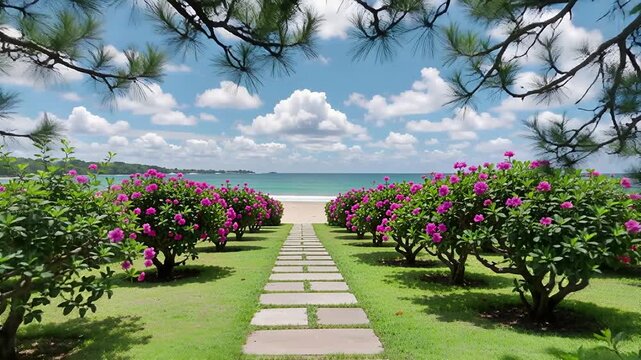 serene garden path leading to a picturesque beach with pink flowers | relaxation, meditation, nature, travel, beauty theme
