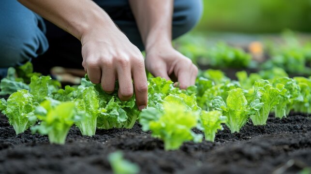 A person is planting lettuce in neat rows during a cloudy day, showcasing the care and attention given to the garden