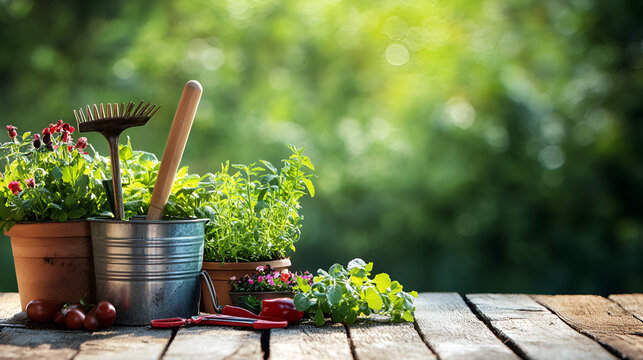 Family Garden: A heartwarming scene of a family collaboratively tending to their flourishing garden, filled with vibrant plants and blooms, with a playful dog.