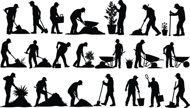 Gardening activities silhouettes: A collection of various silhouette of people engaged in gardening activities, showcasing the diverse tasks and tools of cultivating and maintaining a garden.