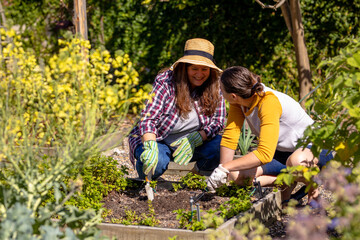 Community garden week with mother and daughter gardening outdoors