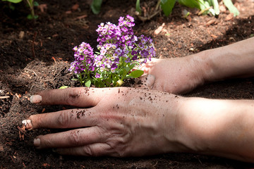 Gardener at work near sprouts of bushes and trees. Horticulture and sale of trees