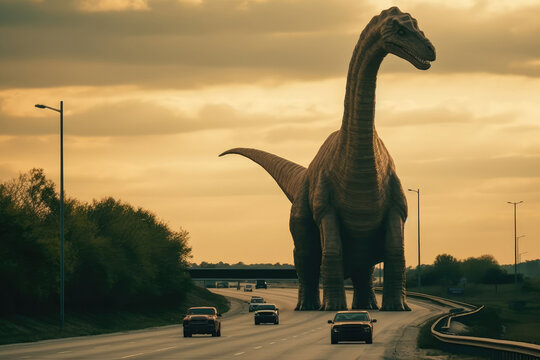 Brachiosaurus Dinosaur Towering Over Highway. Generative AI