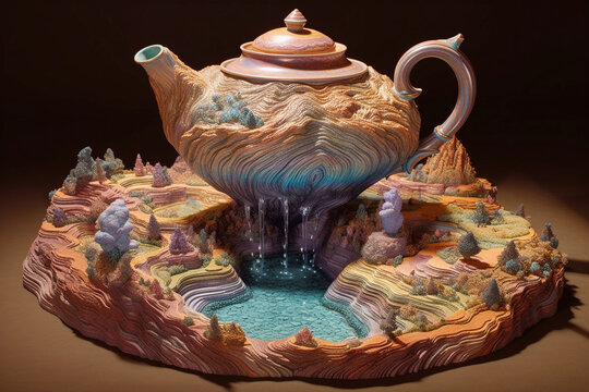 gargantuan teapot pouring an iridescent waterfall. generative AI