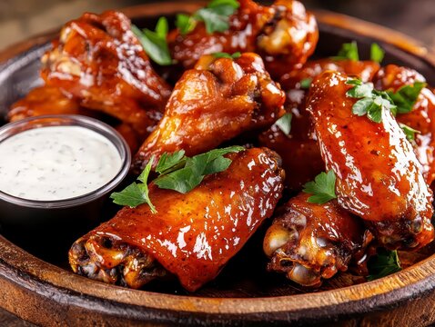 A rustic plate of crispy hot wings glazed in a spicy sauce garnished with fresh herbs and served with a side of ranch dipping sauce ultra HD . Delicious spicy chicken with dip.
