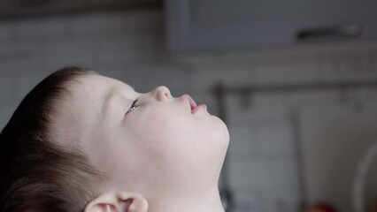 portrait caucasian baby boy child gargling sore throat with medicine, gargle kid close-up view. home treatment children disease. flu cold, infection