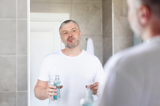 Middle aged man rinsing mouth with blue mouthwash, standing in bathroom in front of mirror. Teeth and oral care