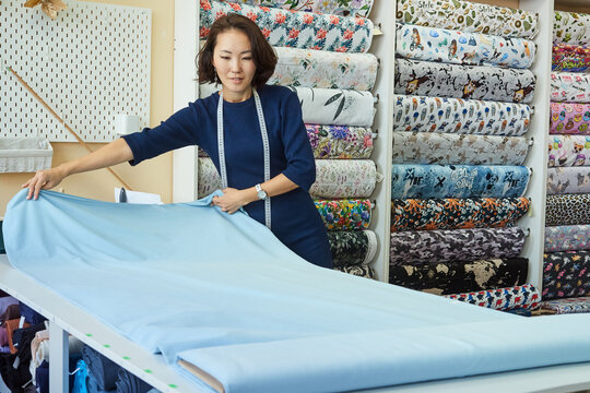 Beautiful Asian woman dressmaker unrolls a roll of blue fabric for cutting. Small business concept.