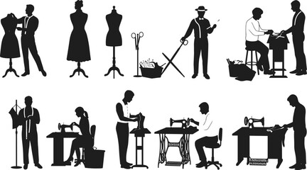 Tailoring and garment making silhouette vector illustration, sewing and fashion design icons set, dress form, sewing machine, tools, teamwork, minimalist style graphic