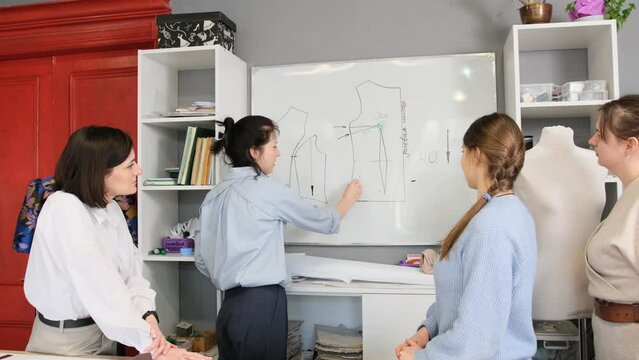 The project manager girl together with a team of young tailors discuss the presentation of the future clothing collection, draws a layout and cutting of clothes on the board