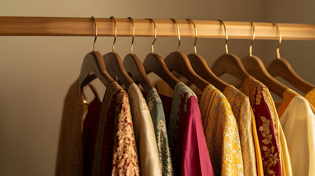 Elegant apparel. Assorted ethnic dresses hang neatly on a wooden rack, showcasing vibrant colors and detailed embroidery, reflecting a rich cultural heritage.