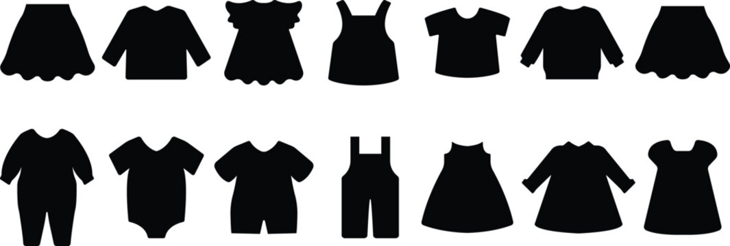 Clothing and fashion glyph icon set. Vector pictograms of shirts, dresses, jackets, shoes, handbags, accessories, and wardrobe items in solid black silhouette style