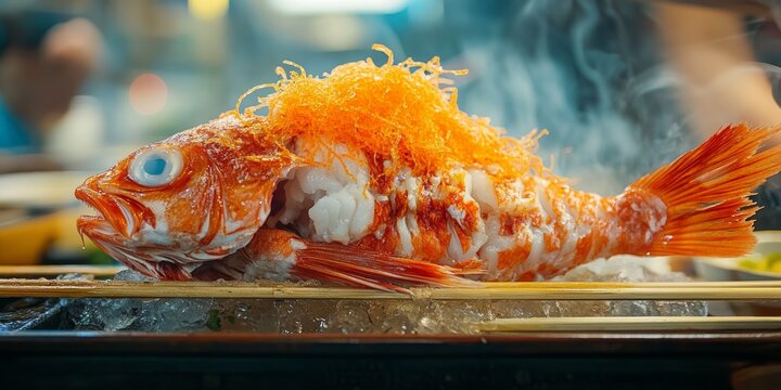 Steaming whole red fish prepared with savory orange threads garnish displayed on ice