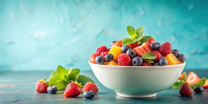 A vibrant mix of summer fruits in a bowl, featuring fresh strawberries, blueberries, raspberries, and melon cubes, garnished with mint leaves, sitting on a teal surface.