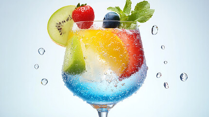 Vibrant cocktail featuring colorful fruits like kiwi, strawberry, and blueberry, garnished with mint leaves, creates refreshing and lively drink