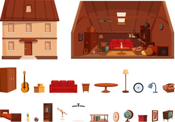 Garret icons set cartoon vector. Attic loft house. Home room wood