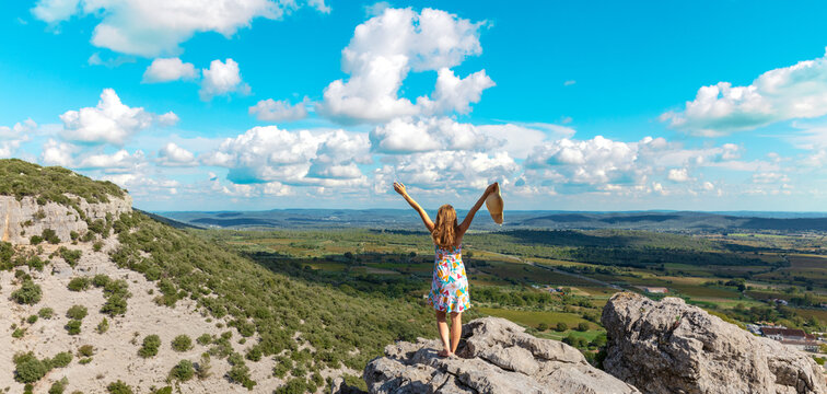 Woman tourist on mountain peak enjoying panoramic view of valley ( languedoc in France)