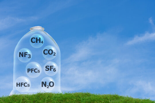 Greenhouse gases. Carbon dioxide, Methane, Nitrous oxide, Hydrofluorocarbons, Perfluorocarbons, Sulfur hexafluoride. Six GHG gases. Cloud and atmosphere pollutants. Vector illustration, flat,clip art