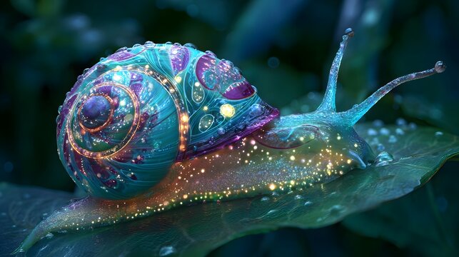 Snails is crawling on green grass, belong to the class of gastropod mollusks with circular, dull brown shells.